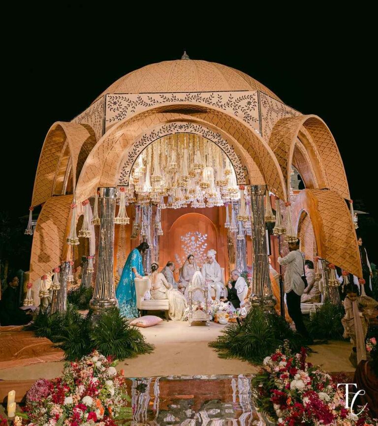 For the Pheras, the setting transformed into a serene and sacred sanctuary. The mandap design featured soft drapery installations that flowed gracefully, creating a dreamy, ethereal effect.